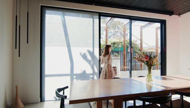 Centors Insektenschutz lässt sich in den Rahmen einfahren, wenn er nicht gebraucht wird. Die Bedienung erfolgt horizontal, sodass der Insekten- und Sonnenschutz auf jeder Höhe über die gesamte Öffnung gezogen werden kann. Die Last ist elegant auf der Griffleiste verteilt, sodass kein unvorteilhafter Handbremsmechnismus zum Einsatz kommt. Einmal geöffnet, verbleibt der Insektenschutz in jeder beliebigen Position und schnappt nicht zurück. So können Sie problemlos von drinnen nach draußen gehen.